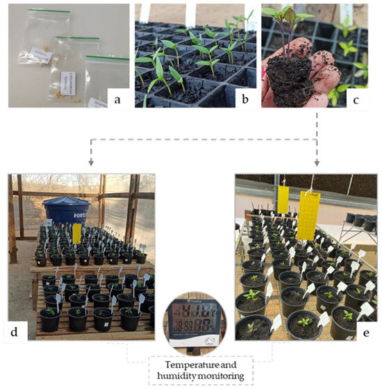 Experimental conditions for pepper plant growth: (a) seeds from the active germplasm bank preserved in plastic bags, (b) pepper seedlings cultivated in 200-cell polyethylene trays, (c) transplanting process showing a seedling with substrate into a #15 pot, (d) mature plants in a climate-controlled greenhouse, and (e) mature plants in a non-controlled greenhouse environment. Reproduced from [26] (CC BY 4.0).