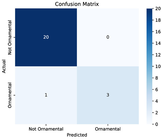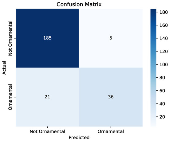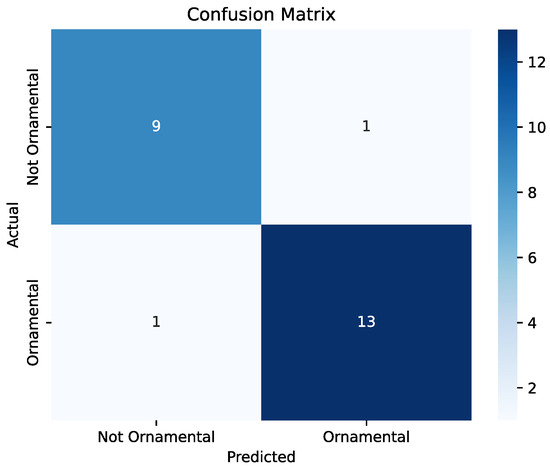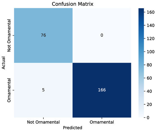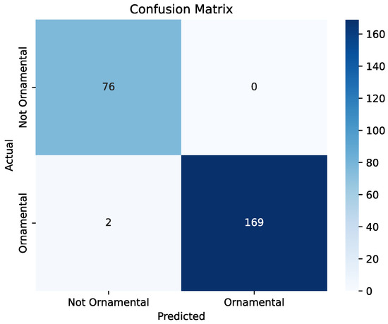 When using the experts criterion for ornamental potential, the ViT-based model achieved an accuracy of 99.20% on the test set, demonstrating its effectiveness in classifying ornamental plants based on images. The precision, recall, and F1-score values were 100%, 98.83%, and 99.41%, respectively, indicating balanced performance in terms of both false positives and false negatives. The confusion matrix is shown in Figure 8.