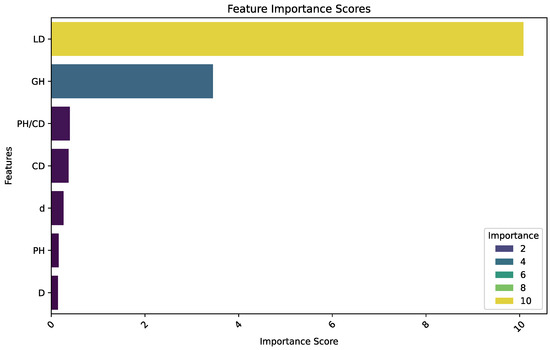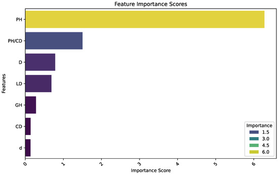 Feature importance scores (gain) obtained with the train dataset for the classification of ornamental pepper plants when using tabular data with morphological measurements and an XGBoost model when classifying based on the median of experts. Acronyms: plant height (PH), canopy diameter (CD), plant height to canopy diameter ratio (PH/CD), growth habit (GH), leaf density (LD), largest diameter (D), and smallest diameter (d).