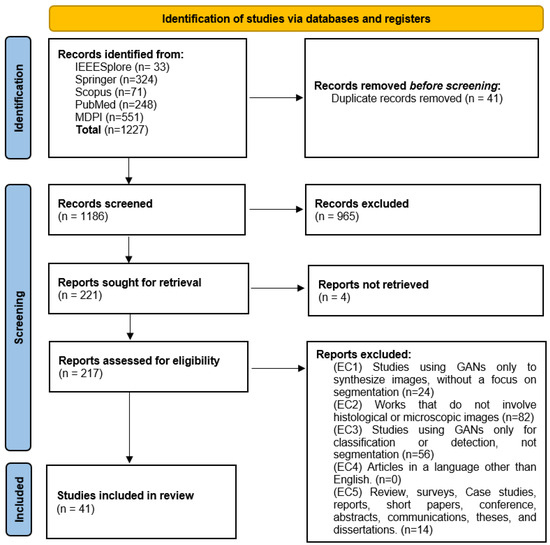 A systematic search for primary studies was conducted on 4 February 2025, using the following digital libraries: Springer Link, IEEE Xplore (Institute of Electrical and Electronics Engineers), Scopus, Multidisciplinary Digital Publishing Institute (MDPI), and PubMed. The search process was carried out by one researcher and validated by two additional researchers to ensure consistency and reliability. The search terms were defined based on the main components of the research, technology, task, and domain, and included the following combination of keywords and their synonyms: (“generative adversarial network” OR “GAN”) AND (“segmentation” OR “image segmentation” OR “semantic segmentation”) AND (“histology” OR “histological” OR “histopathology” OR “histopathological”).