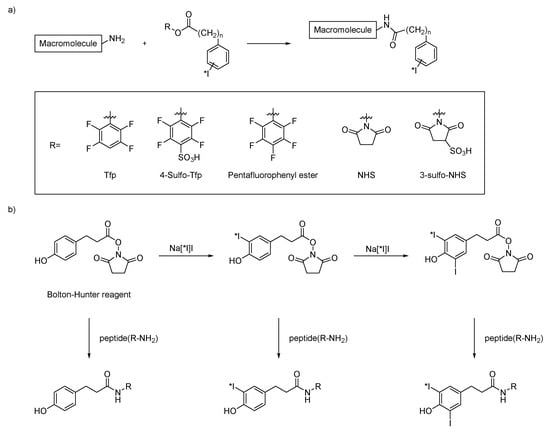 Indirect radioiodination using activated esters. (a) Conjugation of activated esters with NH2 groups of macromolecules. (b) Iodination using the Bolton–Hunter method. (* means that the iodine could either be at 3 or 4 position).