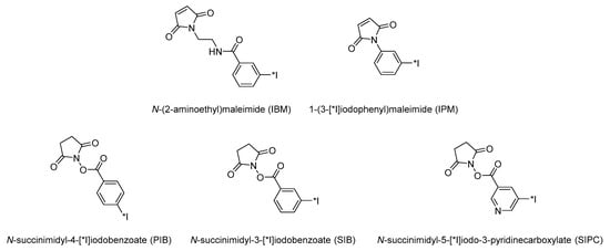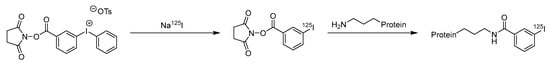 One of the first and most widely used prosthetic groups is the Bolton–Hunter reagent (N-succinimidyl-3-(4-hydroxy-5-[*I]iodophenyl)propionate), which can be conjugated to the N-terminus peptide sequence or side chain amino groups, such as lysine [,,]. The activated aromatic fragment of the Bolton–Hunter reagent is radioiodinated with the necessary isotope of iodine and then conjugated with a macromolecule to obtain the target compound (Figure 4). The most common prosthetic agents used for radioiodination include N-succinimidyl-4-[*I]iodobenzoate (PIB), N-succinimidyl-3-[*I]iodobenzoate (SIB), and N-succinimidyl-5-[*I]iodo-3-pyridinecarboxylate (SIPC) (Figure 5) [,,].