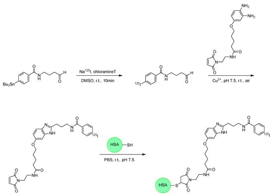 In a 2018 paper, S. Mushtaq et al. [] reported the labeling of an alkylaldehyde with 125I using an organotin precursor, with high radiochemical yield (72 ± 6 percent) and radiochemical purity (>99 percent) (Figure 6). Then, by exploiting the condensation reaction of aryl-diamine and alkyl-aldehyde in the presence of a Cu2+ catalyst under mild conditions to create a maleimide prosthetic group, the radioiodinated precursor was bound to the c[RGDfK(C)] aryl-diamine-derived peptide and also to human serum albumin.