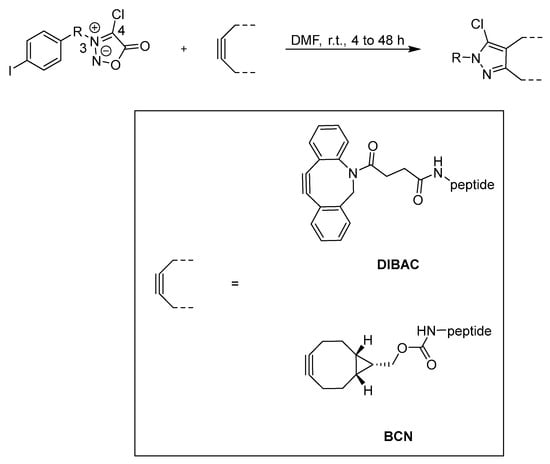 Kinetic studies were performed using model peptides with dibenzoazacyclooctyne (DIBAC) or bicyclononyne (BCN) clickable handles to evaluate the impact of N3 and C4 substituents on sydnones reactivity. The study found that N-alkylsydnones showed the slowest reaction kinetics, while N-arylchlorosydnones exhibited higher reaction rates with the BCN peptide. The high reaction rate of cycloaddition with BCN proved nearly 11 times higher with the chlorosydnone compared to azide.