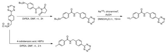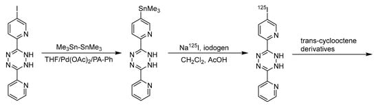 Albu et al. developed a convenient method to prepare radioiodinated tetrazines so that a bioorthogonal reverse electron demand Diels–Alder reaction could be used to label biomolecules with iodine-125 []. Tetrazine was prepared by employing a high-throughput oxidative destannylation reaction that simultaneously oxidized the precursor dihydrotetrazine, as reported in Figure 8. Later, their utility was demonstrated through antibody and hormone labeling experiments.