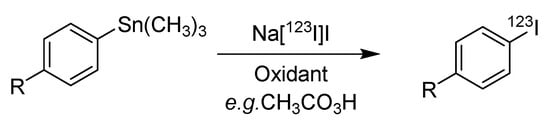 The reaction starts with a stannane precursor and uses an in situ generated iodinated reagent from NaI and an oxidant. The transformation proceeds smoothly and selectively via an ipso SEAr reaction, which leads to the radiolabeled derivatives. Aryltrialkylstannanes are typically synthesized from halogenated precursors through metalation or palladium-mediated reactions. The main advantage of iododestannylation is that it proceeds under mild conditions, and even deactivated aromatic compounds can enter these reactions, yielding iodine derivatives stable in vivo. Stannylation and destannylation reactions usually give high product yields, even when small amounts of starting trialkyltin are used. Unfortunately, the major drawback is the potential contamination of the radiotracer with organotin residues, which can hinder its use in clinical settings. Also, aryltrialkylstannanes can have stability and toxicity issues.