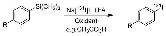 Iododesilylation is another method for radioiodination that uses silanes as precursors for labelling molecules (Figure 11). Compared to iododestannylation, iododesilylation generally results in lower RCYs because the carbon–silicon bond is more stable. It typically involves the reaction of a silylated precursor with an electrophilic source of iodine, often in acidic media [,]. The reaction is generally conducted in acidic media such as trifluoroacetic acid (TFA). To promote the formation of the reactive radioiodine species in situ, reagents such as N-chlorosuccinimide (NCS) and trifluoroperacetic acid can be employed []. [131I]MIBG was labelled in 85–90% RCY starting from the corresponding aryltrimethylsilane in TFA, using trifluoroperacetic acid to generate the reactive 131I-species in situ []. [123I]iodometomidate (IMTO), a high-affinity ligand of adrenal steroidogenic enzymes, has been radioiodinated from a polymethacrylamide-supported precursor []. Interestingly, solid-phase organic chemistry can be used for this reaction, enabling rapid purification of reaction products through simple filtration. In the radioiododesilylation of iodometomidate (IMTO), after the reaction, TFA was neutralized with a polymer-supported amine. The purification step of [123I]IMTO was then performed through elution on a Sep-Pak cartridge, while the unreacted polymethacrylamide-supported precursor could not be eluted. The radiotracer was obtained in 85% RCY and 94% RCP.