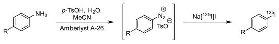 Diazonium salts are employed in nucleophilic aromatic radioiodination reactions and can be used to radioiodinate aryl amines (Figure 12) []. Diazonium salts readily undergo nucleophilic aromatic radioiodination. A challenge with using diazonium salts is their instability. To circumvent this, storage-stable triazenes can be used as synthetic equivalents. However, this approach has limitations, including the need for modified precursors, using a large excess of reagents, and the potential for side reactions [,,]. Diazotisation is typically performed using sodium nitrite at low temperatures in an aqueous solution of hydrochloric or sulfuric acid. The resulting diazonium salt solution is then treated with radioactive sodium iodide. A significant disadvantage of the diazotization method is the high reactivity of intermediate aryl cations or radicals, which can lead to the formation of by-products. An efficient methodology for radioiodinating aryl amines involves using a polymeric reagent to generate nitrite anions. This allows diazotization and the subsequent Sandmeyer reaction to occur under mild conditions and at low concentrations of diazonium salts. This method has been successfully applied to prepare SPECT diagnostics, including [125I]Iomazenil, [125I]CNS1261, and [125I]IBOX, with RCYs ranging from 47% to 75% []. Triazene derivatives are less reactive than diazonium salts, which can limit their use in radiolabeling applications (Figure 12).