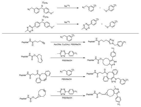 Iodonium salts are highly reactive electrophilic reagents widely employed in radioiodination reactions due to their excellent leaving group ability and compatibility with mild conditions. Their use enables efficient labeling of aromatic compounds with radioiodine isotopes, facilitating the synthesis of radiotracers for imaging and therapeutic applications []. L. Navarro’s study provides several new alternatives to conventional and suboptimal approaches currently in use for radioiodination and astatination of biomolecules (Figure 13) []. The study proposes the use of 125I- and 211At-labeled azide and tetrazine prosthetic groups for bioorthogonal conjugation, designed and tested in a comparative study of five bioorthogonal systems. Radiolabeling, in particular, was performed from precursors of 125I ariliodonium salts. All five bioconjugation reactions conducted on a clickable model peptide produced quantitative yields in times ranging from less than a minute to several hours, depending on the system used. Finally, one of the bioorthogonal systems was used for tagging an IgG.