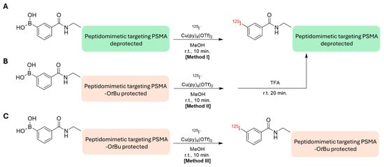 Radiosynthesis of [125I]mIB-PS via boronic precursors using the three methodologies described (Method I–III) by Kondo et al. []. (A) Method I; (B) Method II; (C) Method III.