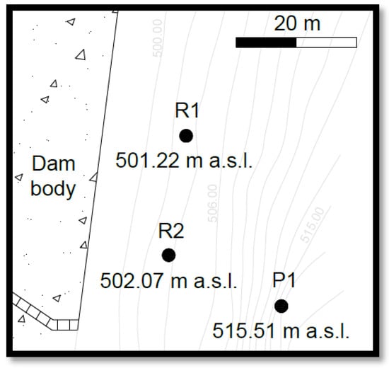 Locations of the original borehole (P1) and test boreholes (R1, R2) in the area of the left bank of the Boboszów reservoir dam.