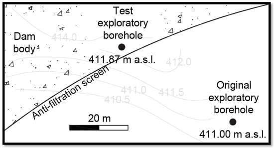 During the construction work, heavy rainfall caused water to flow down along the rocky slope at the left abutment of the partially formed dam, leading to localised erosion. The soil used in the construction of the embankment was found to be susceptible to suffusion. Although the failure occurred at the construction stage, a risk arose that the design solutions proposed to prevent filtration along the left bank of the dam would prove insufficient. In order to verify the adopted assumptions, geological follow-up investigations were conducted in the affected area. Figure 2 shows the location of the original and test boreholes.