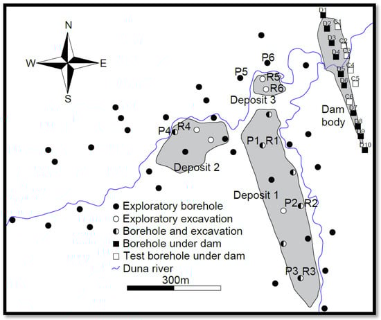 In addition to defining the overall geological structure of the entire reservoir area, the data that the geotechnical documentation must crucially provide for these structures include the identification of the subsoil beneath the dam (and the depth of the load-bearing soils) and the classification of the soils in the reservoir basin in terms of their permeability and suitability for the construction of the dam body embankment (for an earthen dam) or side levees, if any, to adjust the existing terrain morphology []. It is therefore essential to characterise the key parameters of the soils available, such as the plasticity index and degree, the filtration coefficient, the natural and optimum moisture content, the organic matter content, the angle of internal friction and the cohesion []. Comparable approaches are applied in the petrographic and petrophysical characterisation of natural stones intended for structural use, where understanding their mechanical behaviour is equally essential for ensuring durability and stability in engineering applications []. By properly identifying these soil conditions, it is possible to select the most advantageous design variant, ensuring the safety of the structure, i.e., a sufficiently deep dam foundation, the use of appropriately scaled additional structural elements (such as anti-filtration screens) and the use of soils with the best properties to reduce the internal erosion of the embankment, one of the most common causes of dam failures []. Recent advances in the estimation of geotechnical parameters, such as cohesion or Young’s modulus, using regression analysis and soft computing techniques, significantly support the design of earth structures in complex geological settings [,]. Significantly, having accurate data on the extent and type of deposits in the reservoir basin plays a major role in analysing the economic feasibility of a project. Being able to use available materials, with no need for purchase and transportation, substantially reduces the overall project cost []. Here, however, there is a risk that, if insufficient survey data are collected, the volume of soil deposits may be overestimated or that more contamination of the planned construction soil with other fractions may be discovered during excavation. Furthermore, if it is determined during the construction process that the dam body needs to be built at a greater depth than initially assumed, the volume of the dam body will become significantly higher, thus increasing the volume of materials that need to be obtained from deposits or external sources. Similar incidents, which always necessitate design modifications and substantially increase the overall project cost, can lead to delays or even the complete suspension of the construction work where no additional funding can be obtained. In this context, increasing attention is paid to the use of locally available natural stone materials and their classification according to standardised criteria to ensure both economic and structural efficiency. Studies addressing the conformity of such materials with European norms offer useful guidelines for their evaluation and application in engineering practice []. Bearing in mind, inter alia, the aforementioned circumstances, a thorough diagnosis of the soil conditions at the project site is of utmost importance. Each project needs to be approached individually and the technology used should be one that allows for the best possible effect while making rational use of the available resources. Potentially, regardless of the apparently moderately complicated substrate, geological studies should be based on a holistic and multidimensional approach. The core technologies applied when planning the construction of dammed reservoirs in order to determine the soil conditions at the project site include geological boreholes, excavations, dynamic or static probing, and grouting (for water absorption testing) []. Less commonly used are other geophysical methods, such as electrical resistivity tomography, ground-penetrating radar, and surface wave seismic surveys []. In addition, the integration of modern technologies, such as Virtual Reality (VR), into the planning and execution of geotechnical investigations offers new possibilities for visualizing complex geological data and enhancing decision-making processes. Recent studies have demonstrated the effectiveness of VR applications in mining and civil engineering contexts, facilitating better understanding and communication among stakeholders []. While boreholes and excavations can be used to obtain the same data, these methods have their own strengths and weaknesses, as will be discussed further in the article. The role of the developer and the designer should be to plan comprehensive geological investigations, using a variety of core investigation methods (depending on the location), and to determine the density of the measurement points and the extent to which alternative geophysical methods may be applied.