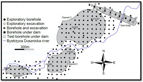 The dams of both reservoirs were designed to be founded on the roof of the Cretaceous layer, particularly on rock formations (marl or sandstone). At the construction stage, it was noted that the load-bearing soils in many areas did not reach the elevation designated as the soil replacement line, with locally significant deepening. This circumstance resulted in the need to conduct follow-up investigations of the subsoil beneath the dam body. In addition, given the potential increase in its volume (due to the deepening of the foundation), the soil deposits in the reservoir basin were also investigated to verify their actual quantity and availability. The locations of the original boreholes and the test excavations and boreholes are shown in Figure 6 and Figure 7. The boreholes and excavations on the deposits used in the further analyses are labelled with the letters P and R, respectively. Similarly, the original and test boreholes beneath the dam body are labelled with the letters D and C. In order to accurately depict the geological conditions of the area of both dams-cross sections through the valleys in which they were formed have been added in Supplementary Figures S1 and S2 [,]. A photograph representing the location of the deposits and the nature of the construction area is included in Figure 8.