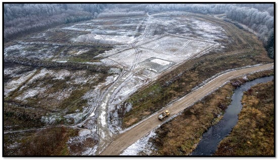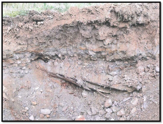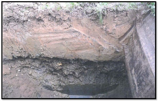 Figure 14, Figure 15 and Figure 16 provide an overview of selected results of the geological surveys of the deposits in the Krosnowice reservoir basin, categorised by two different technologies: boreholes drilled at the project planning stage and excavations serving as follow-up investigations [,]. To illustrate the nature of the soil in the deposits, a photograph taken in excavation R3 is shown in Figure 17.