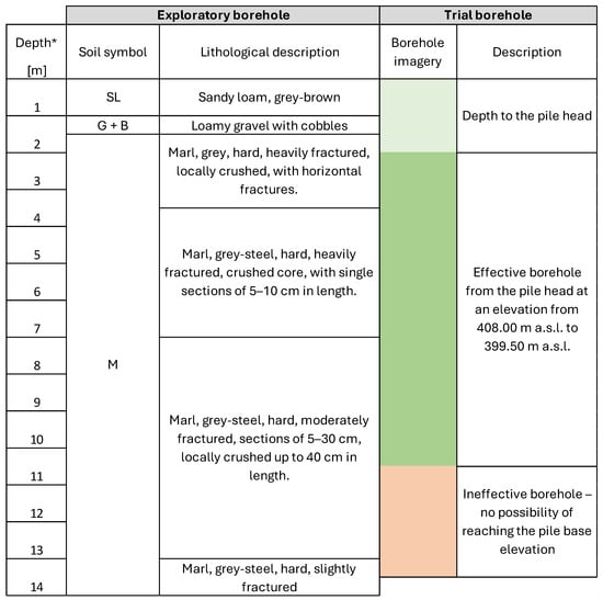 Summary of the exploratory borehole results with the trial borehole result for a CFA pile []. * From an elevation of 410.00 m a.s.l.