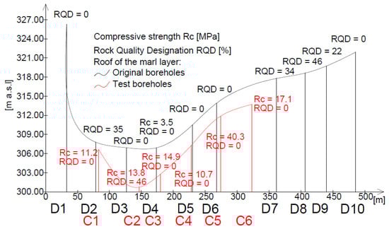 Analysing the profile in Figure 9, the difference in the depth of the Cretaceous layer roof in both compared profiles is undeniable. Based on the results of the follow-up investigations, the rocks (marl) in profiles C1 to C6 are located on average 3.25 m lower than in the original investigations, with the greatest difference of approx. 6 m at point C2. It is also important to consider the result obtained for point C6, which is located in the D1–D10 profile line. Irrespective of this location, the depth of the marl layer roof clearly deviates from the depth that would be predicted by interpolation between points D6 and D7. This may confirm the complex geological structure beneath the dam body and no clear boundary between rock debris and highly fractured marl or suggest some differences in the interpretation of the soil type in the obtained samples. The compressive strength in the original investigations was determined at one point only, i.e., D4, but this result correlates with the results of the follow-up investigations, demonstrating the very low strength of the rocks in the upper zone of the layer []. Similarly, the RQD parameter obtained in both investigations indicates a very poor rock mass quality, with a value of 0% at most points.