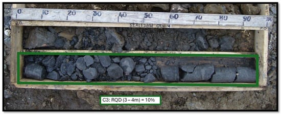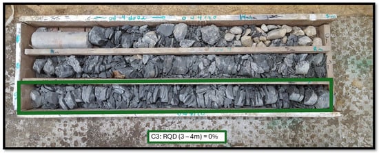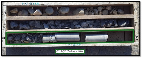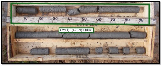 Figure 11 shows profiles illustrating the depth of the Cretaceous layer (marl) in a cross-section, based on the original investigations (D1–D10) and follow-up investigations (C1–C6). Furthermore, each point is labelled with the compressive strength (Rc) and Rock Quality Designation (RQD) values obtained at the depth of the layer closest to the roof. To illustrate the nature of the rock cores in the control survey, Figure 12 and Figure 13 show the soil extracted at points C2 and C3 from the top of the marl layer.