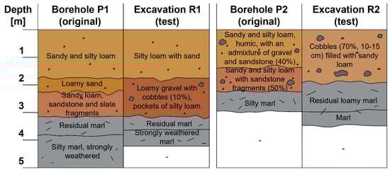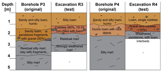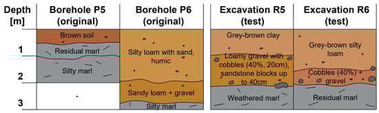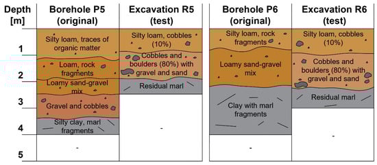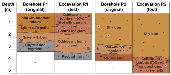In the first place, it should be noted that the total number of boreholes drilled directly in the area of deposits no. 1 and no. 2 (nine and three boreholes, respectively, in areas of approx. 7.5 and 2.5 ha) is small relative to their surface area; also, no borehole was drilled in the area of deposit no. 3. Most importantly, however, the compiled results of the investigations reveal noticeable differences in the type of soil at a given depth; this is also true for the boreholes and excavations made in exactly the same location. At point no. 1, where the original investigations identified loamy sand and sandy loam, the follow-up investigations revealed mainly gravel with cobbles, with the presence of silty loam being limited to some pockets. Similarly, in the cases of points nos. 2, 3, and 5, the excavations revealed a markedly stronger presence of gravel and cobbles compared to the results of the boreholes, suggesting lower-than-expected deposits in this location. Conversely, in the case of deposit no. 3, the boreholes drilled in the vicinity (particularly borehole no. P5) suggested a low potential for obtaining material suitable for the dam body. However, excavations R5 and R6 made directly within the deposit revealed the presence of valuable loam immediately beneath the surface.