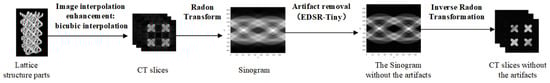 In this paper, a new lightweight CT artifact reduction framework that combines a tailored small Enhanced Deep Super-Resolution (EDSR-Tiny) network with Radon transform theory is proposed. To improve spatial resolution, the entire procedure starts with a bicubic interpolation of low-resolution CT slices. The Radon transform is then used to turn the interpolated slices into sinograms. In the sinogram domain, we employ an artifact removal technique to deal with the corruption caused by metal. The corrected sinogram is then restored with improved fidelity using a self-designed lightweight EDSR-Tiny network that includes a single-layer residual structure and a Radon-consistent loss function. Lastly, the artifact-reduced CT images are reconstructed using the inverse Radon transform. Peak signal-to-noise ratio (PSNR) and signal-to-noise ratio (SNR), two widely used picture quality metrics, are employed to assess the efficacy of this method. Results from experiments on actual industrial CT datasets show that the method proposed maintains low computational complexity while achieving competitive artifact suppression and detail preservation performance. This paper’s contributions include the following: