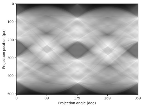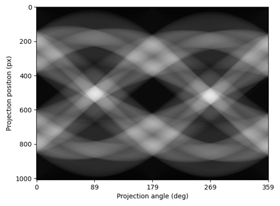 The Radon transform reveals the integral projection information of CT images at various angles by converting the spatial domain image into a sinusoidal graph in the projection domain. A crucial input for the ensuing artifact difference processing, the sinogram graphically depicts the artifact features brought on by the metal structure. A two-dimensional spatial image can be transformed into a collection of its projections at various angles using the Radon transform. The following is its formula:
