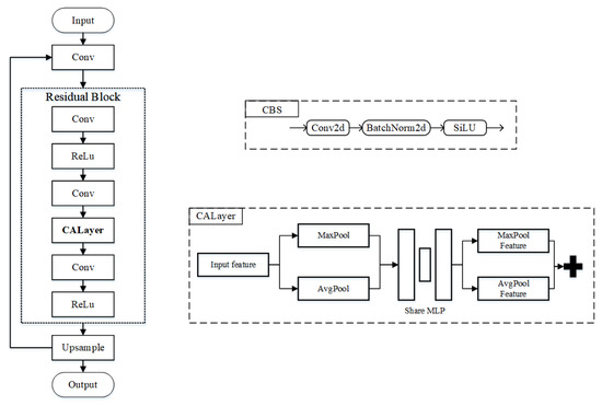 Representation of residual blocks: There is a single residual block in the network. The convolution and ReLU activation layers are used to nonlinearly map the features within each residual block, and a channel attention mechanism (CALayer) is introduced to modify the channel weights. The i-th residual block’s input–output relationship can be written as follows: