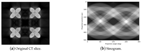 The CT slices need to undergo Radon transformation. Figure 9a shows the original CT slice after scanning, and it can be seen that there are very heavy metal artifacts. Figure 9b shows the sinogram of the original CT section after the Radon transformation.
