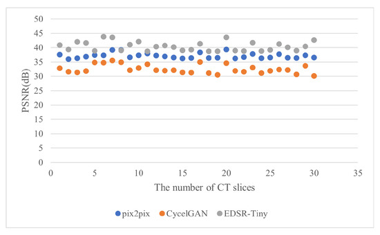 The PSNR results of the test set. The CT slices obtained by the EDSR-Tiny method are almost always superior to the other two methods.