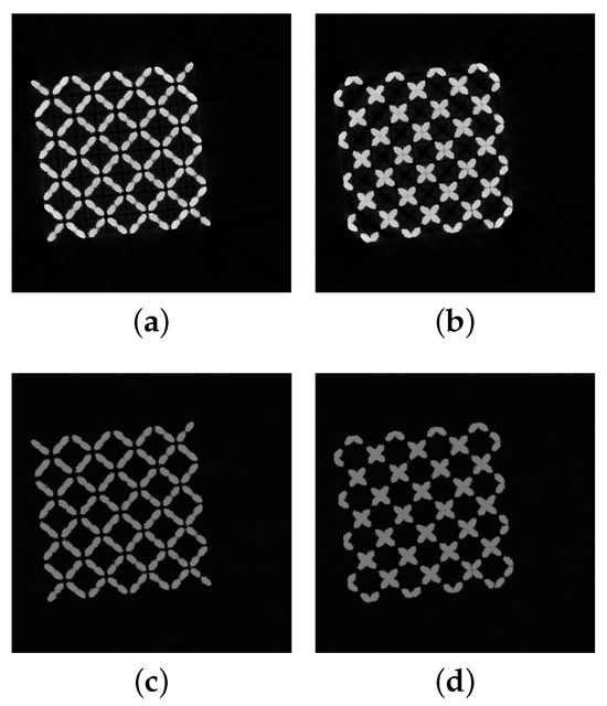The optimization result of the diamond lattice structure artifact reduction for stainless steel 316L. It can be seen from this that the method proposed in this paper can effectively remove metal artifacts. (a) Original CT slice 1. (b) Original CT slice 2. (c) CT slice 1 after removing artifacts. (d) CT slice 2 after removing artifacts.