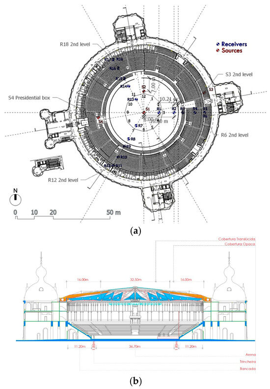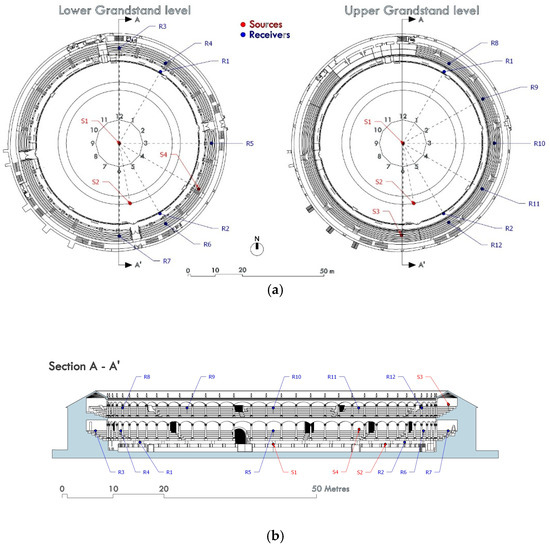 (a) Section and (b) floor plans of the bullring of Ronda showing the 4 sound sources and 12 receiver positions.
