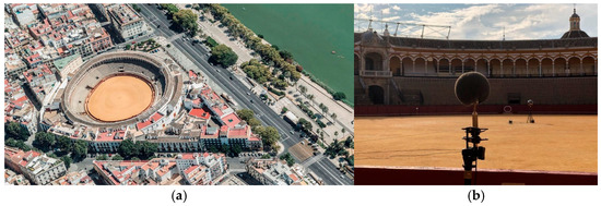 (a) Aerial view of the Seville bullring (Source: Carbajal Studio with permission http://www.estudiocarbajal.com/en/our-project-for-holiday-apartments-in-calle-adriano-in-diario-de-sevilla/ (accessed on 29 May 2025)). (b) Interior view of the bullring of Seville, with the sound source in position S1 and the Core Sound TetraMic microphone in the passageway (Source: Authors’ own).