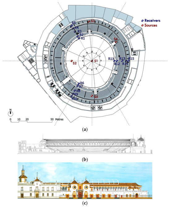 (a) Floor plan of the Seville bullring showing the positions of the sound source (S) and receptors (R) (Source: Authors’ own); (b) Section of the bullring (Source: Carbajal Studio with permission, http://www.estudiocarbajal.com/en/refurbishment-works-of-real-maestranza-bullring/ (accessed on 29 May 2025)); (c) General elevation from Paseo Colón (Source: Miguel Molina Castillo. University of Seville. School of Architecture. Chair of Analysis of Architectural Forms).