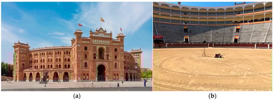 This bullring was designed with the intention of building a monument on the same scale as that of the city, and hence the volume, the portal, and the antechamber of the bullring take on truly significant dimensions [24]. Construction began in 1919 (architect José Espelius Anduaga) and was completed in 1931 (architect Manuel Muñoz Monasterio) (Figure 5a).