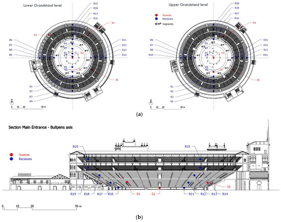 Figure 4 displays the floor plan of the bullring, which shows the positions of the source and receivers, together with its section. In all the 75 source–receiver combinations that have been utilised to record the impulse responses, there is direct sound.