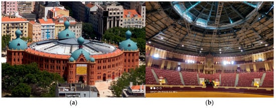 (a) Aerial photograph of the renovated bullring of Campo Pequeno in Lisbon (Source: https://en.wikipedia.org/wiki/File:Campo_Pequeno.jpg (accessed on 9 May 2025)). (b) Interior view of the Campo Pequeno bullring, showing the Presidential box and Sector 2, Sector 1 even and odd, and Sector 7 (Source: Authors’ own).