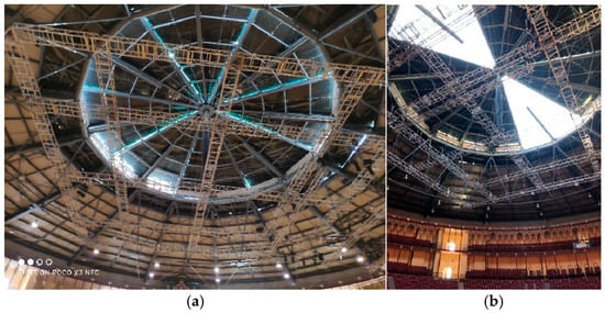 View of the oculus of the roof of the Campo Pequeno bullring: (a) with the oculus closed; and (b) with the oculus partially open (Source: Authors’ own).