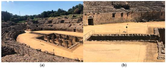 The case study of the Roman amphitheatre of Italica (Figure 10) takes place as a type of precursor to the modern bullring and represents a connection to the theoretical perspective of the acoustics of performances held in the ancient buildings of theatres and circuses, studied by the authors of this work [26]. The modern conception of the circular bullring in the 18th century retains many influences from the ancient amphitheatres: “the arena becomes a ring”. Regarding the time of its construction, there is a general agreement of opinions that advocate the Hadrianic period, approximately between the years 117 and 138, although of unknown architect; like most Roman constructions, given the magnitude, it is thought that several architects intervened therein. Its original appearance would have been that of a great structure of opus caementicium covered with marble slabs and stone from Tarifa. Its seating would have consisted of a podium and three caveas (ima, media, and summa), with a distribution of the amphitheatre tiers on three equal surfaces (podium and ima, media, and summa), the first two tiers of which are still in existence today.
