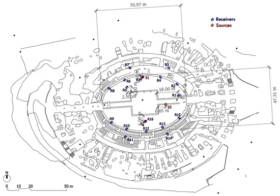 Figure 11 and Table 3 show the 49 source–receiver combinations used in this space. In the Roman amphitheatre of Italica, the 3 positions of the sound source and the 17 receivers took into account that its arena was designed as an oval in which the relationship between its 4 foci forms a Pythagorean triangle with a ratio of 3:4:5. Therefore, these sources were selected near the foci due to the presence of the fossa bestiaria, and to certain alignments on which the curves corresponding to the four sectors of the oval were drawn.