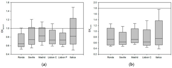 Figure 12 shows the statistical data for the results of the echo criterion parameter (EK) for speech and music in the cases studied. For these calculations, the voice-source positions indicated in Section 3 and receivers in the audience area (segments of stalls, grandstands, boxes, etc.) are considered, as are those for the sound source of a musical nature and receivers in the audience area. From this figure it can be observed that, in the Ronda and Lisbon P (partially open oculus) configurations, all the sample data lie below the critical threshold, and for Seville, Madrid, and Lisbon C (closed oculus), the upper limit of 99% confidence interval is below or near the critical threshold. Only in the Italica amphitheatre do the data exceed this limit. Figure 12a also shows the similarity of the results in the Lisbon bullring in the two roof configurations. As for the EK for music, all the results, even for the Italica amphitheatre, are below the echo risk threshold, and, in the case of the bullrings, the results are far below this echo risk threshold. While these data indicate how these spaces behave with respect to echo problems in the spectator area, it remains necessary to analyse the timing of these strong reflections and their connection to impulse responses; this is carried out in the following sections.