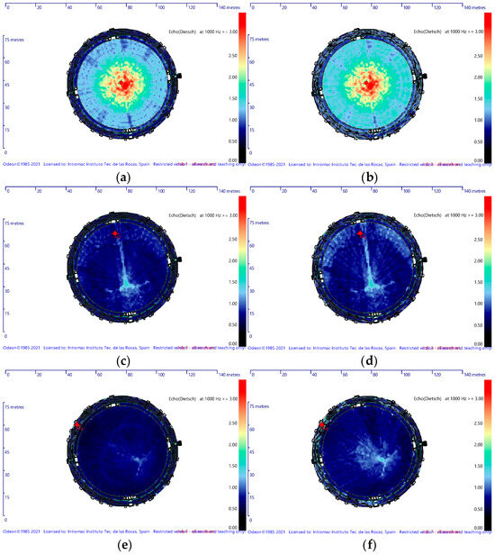 Figure 9 shows the 108 source–receiver combinations corresponding to 4 positions of the sound source and 18 receivers with the roof oculus closed, and 2 positions of the sound source and 18 receivers with the roof oculus partially open. Of these measured combinations, 24 correspond to both the sound source and receiver located in the ring that have been used. Only in one combination, S3-R5, is there no direct sound.