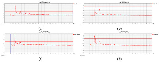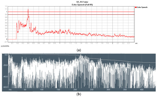 Furthermore, in the centre-symmetric source–receiver combinations S1-E4 and S1-E6, the strong reflection occurs at 49 ms, which is within the range that reinforces the direct sound. Hence, speech intelligibility is good, and no echo is present. In the centre-symmetric receivers E3 and E5, at distances of 15 m, a double echo can be observed for speech at the same time points.