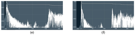 Regarding the situation when the sound source is located in the centre of the bull-ring S1 and the receiving microphone is located in Las Ventas arena (Table 8), it can be observed that there is a risk of echo in receivers E1 and E2 for both speech and music. The energy–time and Schroeder curves and the echo parameter values of these two receptors are presented in Figure 15. Figure 15a shows that E1 has a double echo for speech, and E2, Figure 15c, has a triple echo for speech. The EKspeech values and the times of all these reflections are indicated in Table 8.