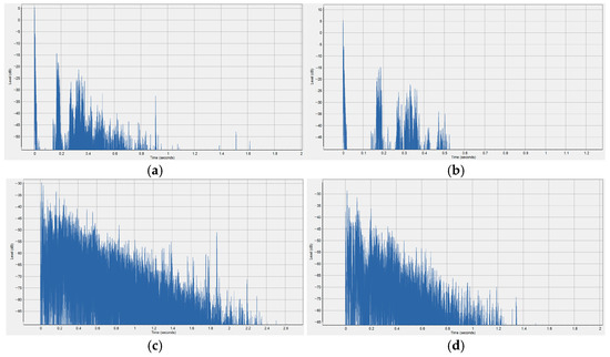 Impulse responses in two source–receiver combinations of Las Ventas bullring (a) S1-E1 without the audience; (b) S1-E1 with the audience; (c) S1-R11 without the audience; and (d) S1-R11 with the audience.
