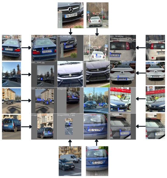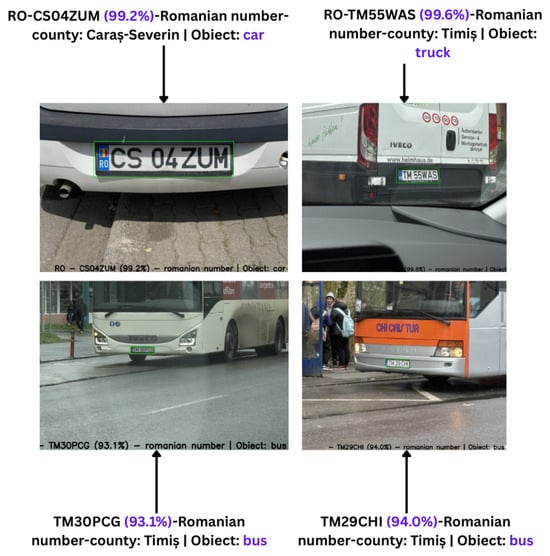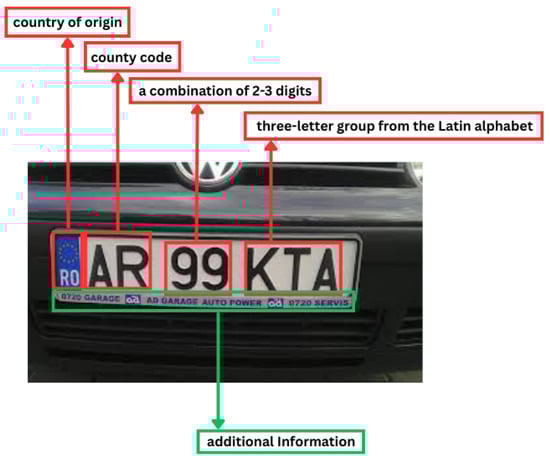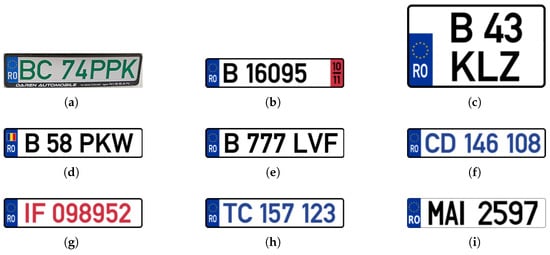 Automatic license plate recognition (ALPR) from images covers a wide range of applications across various domains, such as vehicle charging and parking systems (intelligent parking management systems [,,]), safety and public order applications (detection of stolen vehicles [], vehicles without valid technical inspection, without mandatory car insurance, without vignettes [], vehicles that exceeded the speed limit, vehicles that ran red lights, etc.), restricted area access control applications, and so on. ALPR encounters challenges such as low-lighting conditions [], the angle at which the vehicle appears in the image [], obstruction of the license plate by insects, dirt, and the different formats in which license plates occur in various countries [,]. There are a lot of variations in license plate formats across different countries in terms of size, orientation, location, font, style, color, language, etc. []. Therefore, many recent studies on automatic license plate recognition were performed using datasets with vehicles registered in Germany [], Egypt [], Israel and Bulgaria [], Iran [], Bangladesh [], Indonesia [], etc. There are also variations in the format of these license plates within countries. For example, German plate formats vary depending on the type of vehicle and the region []. The Romanian license plates that were used in this study vary in size depending on the type of vehicle, vary in alphanumeric structure and vary in font color (black, red, green, blue) []. According to the authors’ current knowledge, the format of Romanian license plates shares common characteristics with the license plate formats of other countries around the world, but their structure, which includes a specific county code followed by a combination of digits and letters, is not identically found in other countries. Therefore, the format of Romanian license plates is unique in terms of its specific combination of elements.