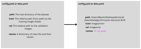The connection between these resources and the YOLO detection algorithm is made through the config.yaml file (Figure 4), which specifies the paths to the train and val directories, as well as the labeled object class, in this case “car_plate”.