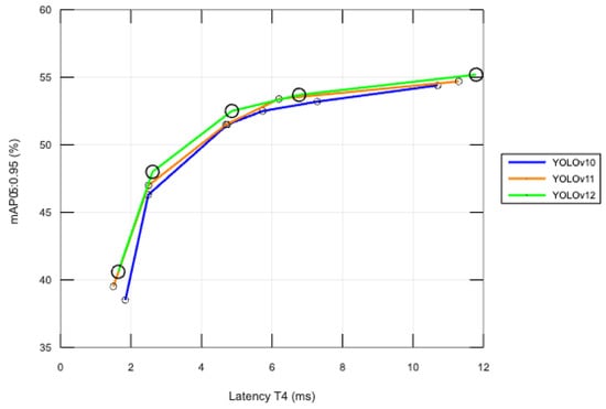 Figure 5 illustrates the performance of three successive versions of the YOLO (You Only Look Once) architecture—YOLOv10, YOLOv11, and YOLOv12—based on inference time (Latency T4, expressed in milliseconds) and mean accuracy (mAP@0.5:0.95), using the COCO validation dataset.