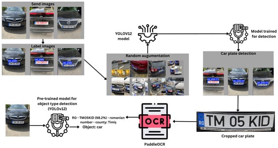 The main contributions of this research include the construction of a manually labeled dataset, which contains 744 images of vehicles registered in Romania (expanded by augmentation in the training stage to 14,880 images), publicly available on GitHub []. Additionally, the source code used for training and evaluation has also been made available to facilitate reuse, verification, and further development by the research community. Also, the proposed system was trained and evaluated for automatic license plate detection in images, using the most recent YOLOv12 model. To the best of the authors’ current knowledge, this is the first documented application of the YOLOv12 version for this problem, the obtained results demonstrating superior performance compared to the previous version. Furthermore, the combination of YOLOv12 and PaddleOCR is, as far as we know, unique among the reviewed studies.