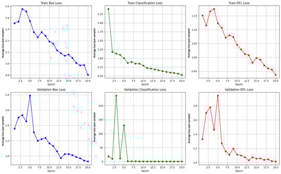 In parallel, the loss values on the validation set (box_loss, cls_loss, and dfl_loss, represented in the lower graphs of Figure 9 by the blue, green, and red curves, respectively) showed a slight decrease, indicating ongoing refinement and a reduction in localization and classification errors. In the final epoch (epoch 20), relatively low loss values were recorded confirming stable model convergence. The best generalization results were achieved in epoch 19, which yielded the highest mAP@0.5:0.95 score.