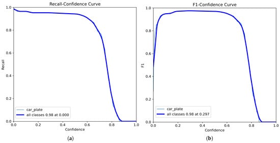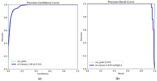 By analyzing the precision–confidence curve [], shown in plot (a) of Figure 10, it can be observed that if only predictions with a confidence score above 0.314 are kept, the model will return only correct results for license plates. The plot displays two lines: one for the “car_plate” class and a global average, which is automatically shown even in single-class scenarios.