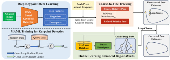 To address the aforementioned challenges, we propose DK-SLAM, a novel deep keypoint-based SLAM system that incorporates deep keypoint extraction through meta-learning, coarse-to-fine feature tracking, and an efficient online learning-based loop closing. Our DK-SLAM employs an enhanced Model-Agnostic Meta-Learning (MAML) strategy to extract robust deep local features, improving the system’s ability to perform feature extraction in diverse and dynamic environments. This meta-learning strategy enables our DK-SLAM system to adapt to diverse conditions without the need for additional training during deployment, thereby enhancing its applicability in real-world scenarios. Additionally, we introduce a novel feature matching strategy tailored for deep learned keypoints. This strategy involves a two-stage process: initial estimation of relative poses using patch photometric loss optimization, followed by refinement through 3D–2D relationships, resulting in improved matching accuracy and robustness. Furthermore, to enable a more effective and efficient loop closing, we propose an online learning-based Bag-of-Words (BoW) model. Our model compresses learned features into binary descriptors and utilizes images from previous timesteps within an online learning framework. It constructs a dynamic tree structure for Bag-of-Words, facilitating loop closure detection in new environments.
